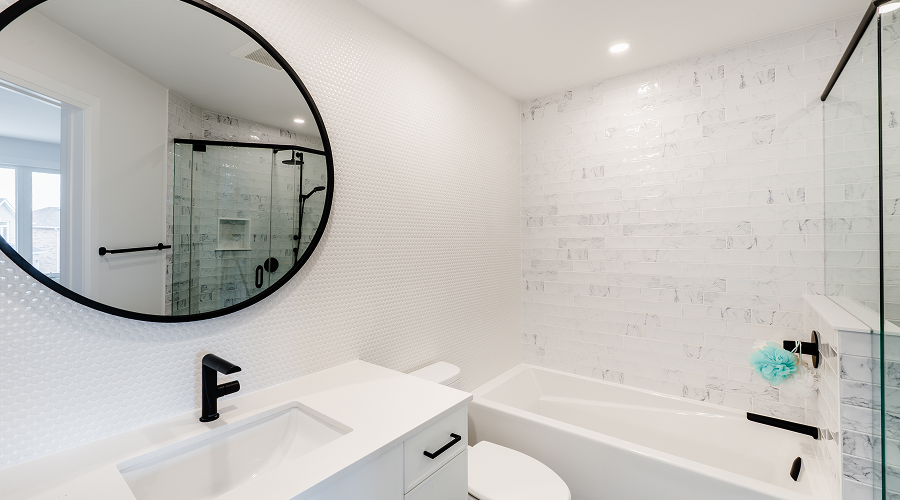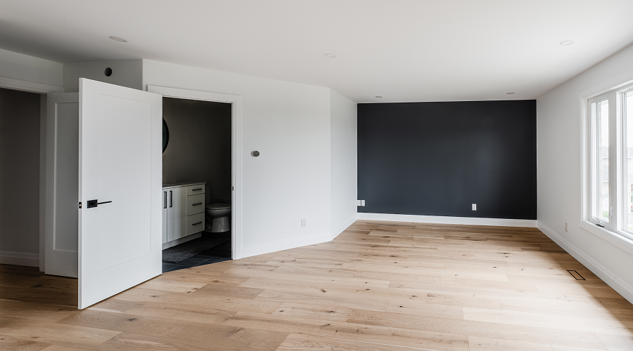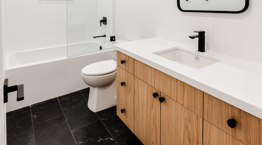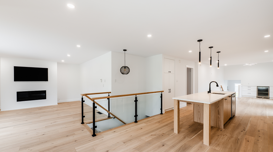To make the homeowner’s vision work, we extended the kitchen floor area to fit a custom bar, and reconfigured the entryway by removing the original foyer closet to reclaim valuable space. The transformation features a bright, custom kitchen with contrasting black fixtures, wide-plank wood floors, and a modern fireplace wall that anchors the living area. A sleek glass guardrail along the staircase adds both safety and a contemporary design statement.